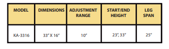 • Standard table dimensions: 33” x 16”